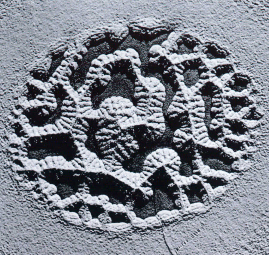 Natürlich lassen sich zahlreiche Vorgänge analysieren, messen, in Formeln darstellen. Natürlich sind Formeln, Kurven, Wahrscheinlichkeitsrelationen auch der Wirklichkeit abgenommen. Sie sind Abdrücke der Wirklichkeit und sind als solche auch real. Man kann mit ihnen auf diese Wirklichkeit einwirken, ja neue Wirklichkeiten (z.B. in der Technik) kreieren. Aber sie sind von der Wirklichkeit abgenommen; sie sind außerhalb des wirklich Existierenden; dies Letztere ist mehr, viel mehr als die Formel, als die quantitative Bestimmung darüber aussagt. Es werden immer nur gewisse Seiten des Phänomens erfasst. Wie aber soll denn das volle Phänomen, die wirkliche Wirklichkeit überhaupt erfasst werden? Rein naturphilosophische Ideenbildung, die in Gedankenbildern die Natur malt, ist auch nicht imstande, die voll elbendige Existenz festzuhalten. Sie ist »oberhalb« der wirklichen Wirklichkeit. Auch dieser spekulativen Betrachtungsart gegenüber behält das volle Leben sein Geheimnis. Es wird sich nur dann immer mehr und mehr zeigen, wenn man es nicht nur zergliedert, in Gerippe zerlegt, wenn man es nicht nur denkt, sondern wenn man sich von ihm gar nicht entfernt, sich weder über es erhebt noch es tötet. So sehr es auch scheinen mag, dass damit »nichts« erreicht wird, so sehr ist diese anhangende Beobachtung der Weg, der der Forschung die Quellen erschließt, den Atem erhält, das Leben gewährt. Es wird sich im Lauf dieser Schilderungen erweisen müssen, ob auf diese beobachtende und immer wieder beobachtende Weise, ob dieses Zusammenhalten des Beobachteten, dieses Ganzsein-Lassen des Phänomens zu Konturen von Grundphänomenen führt und etwas Essenzielles und Wesenhaftes erkennen lässt. Das Lykopodiumpulver wird gleichmäßig auf eine Membran aufgestreut: Bild 74 . Die Membran wird durch einen Ton erregt“.